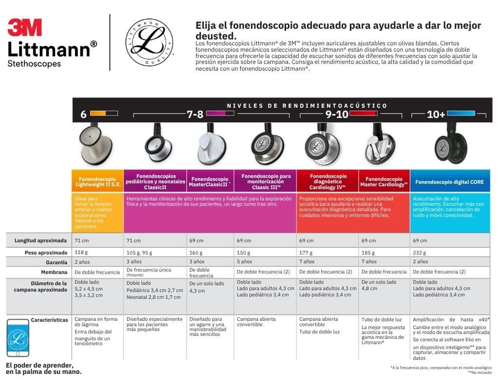 Escuche a un nivel completamente nuevo El fonendoscopio 3M Littmann CORE aprobado por la FDA cambia entre los modos de escucha analógico y amplificado para que usted pueda escuchar de la forma que desee durante las exploraciones. La tecnología de membrana de doble frecuencia (patentada por 3M) le permite escuchar sonidos de diferentes frecuencias con solo ajustar la presión ejercida sobre la campana. Mantenga ligeramente presionada la campana en el paciente para escuchar sonidos de baja frecuencia y ejerza un poco más de presión para escuchar sonidos de mayor frecuencia. Las olivas superblandas se adaptan a las orejas de cada persona para ofrecer la comodidad óptima y un aislamiento acústico excelente. El fonendoscopio 3M Littmann CORE funciona con el software Eko en dispositivos iOS y Android para ofrecerle un medio que cumple las normas HIPAA para grabar y anotar grabaciones de 15, 30, 60 o 120 segundos en un panel seguro. Cree una biblioteca de tonos cardiacos para supervisar el progreso de una enfermedad o con fines educativos y comparta las grabaciones con sus compañeros. El fonendoscopio 3M Littmann CORE combina el accesorio CORE Eko y el fonendoscopio 3M Littmann Cardiology IV. Consulte las instrucciones de uso y las indicaciones en los respectivos manuales de usuario.